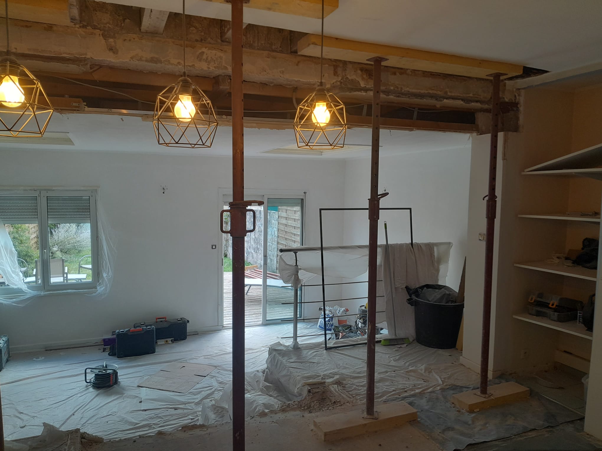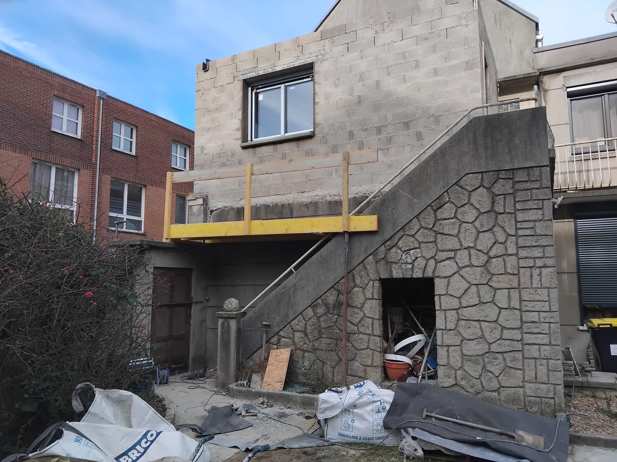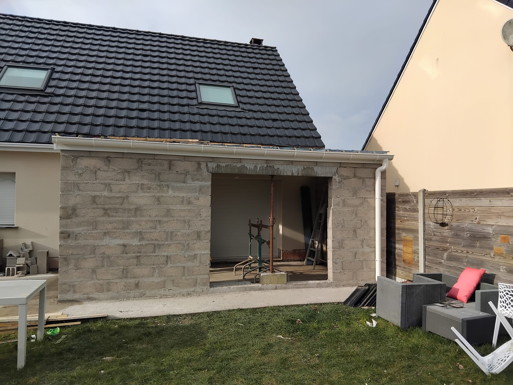 Les travaux en cours comprennent la démolition, les fondations, la dalle béton, l’élévation des murs en parpaings, la pose de la charpente et de la toiture, ainsi que l’installation des menuiseries.