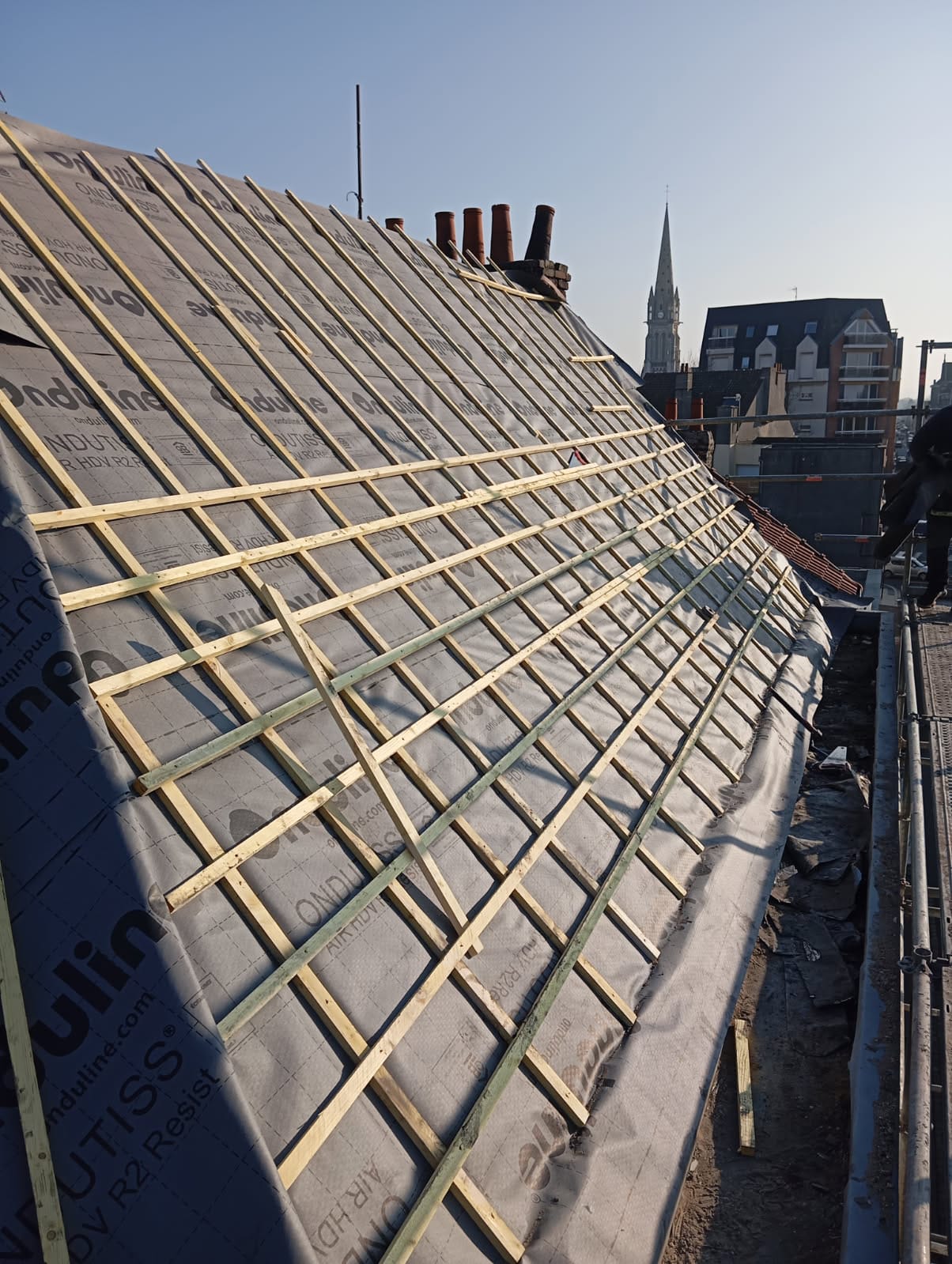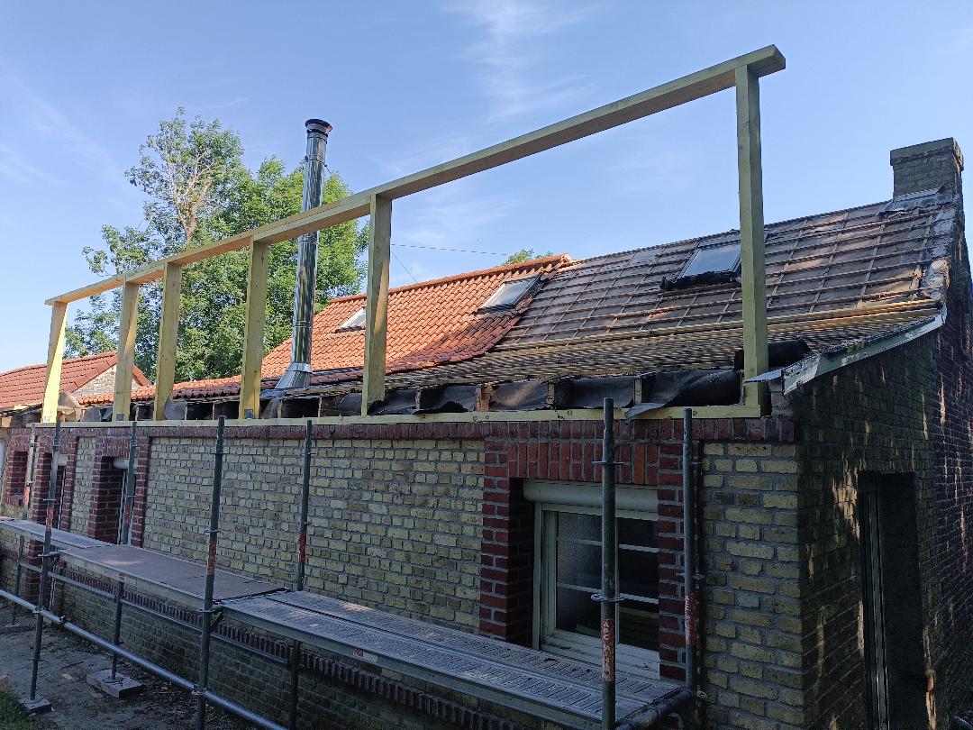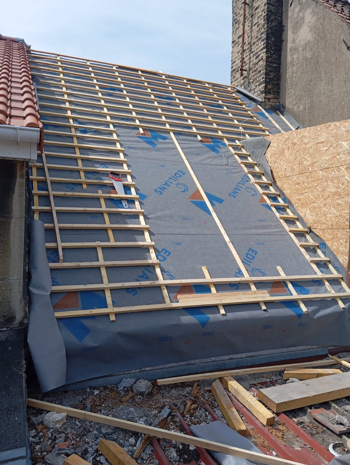 Les travaux en cours comprennent la démolition, les fondations, la dalle béton, l’élévation des murs en parpaings, la pose de la charpente et de la toiture, ainsi que l’installation des menuiseries.